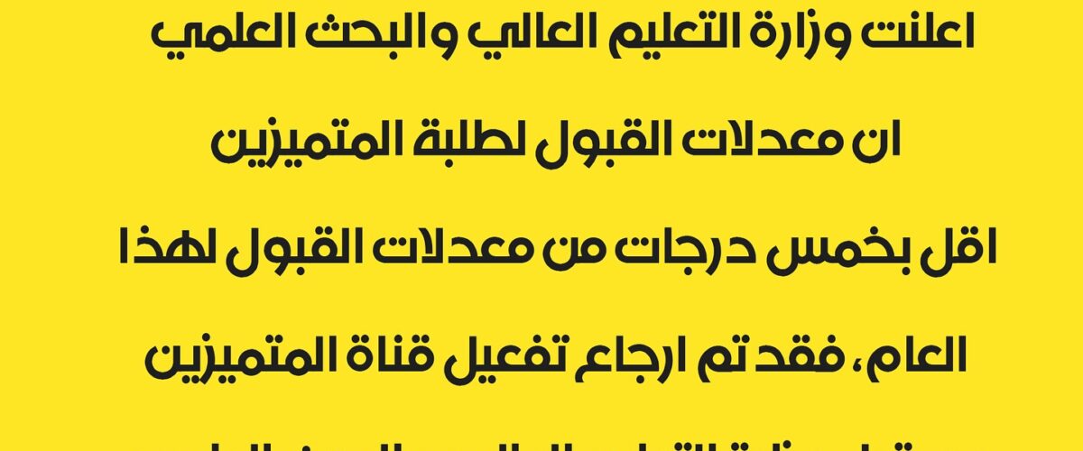 خبر مهم لطلبة مدارس المتميزينAbdulrazzaq Alsaeed1 November، 2025اعلنت وزارة التعليم العالي والبحث العلمي ان معدلات القبول لطلبة المتميزين اقل بخمس درجات من معدلات القبول لهذا العام، فقد ... قراءة المزيد