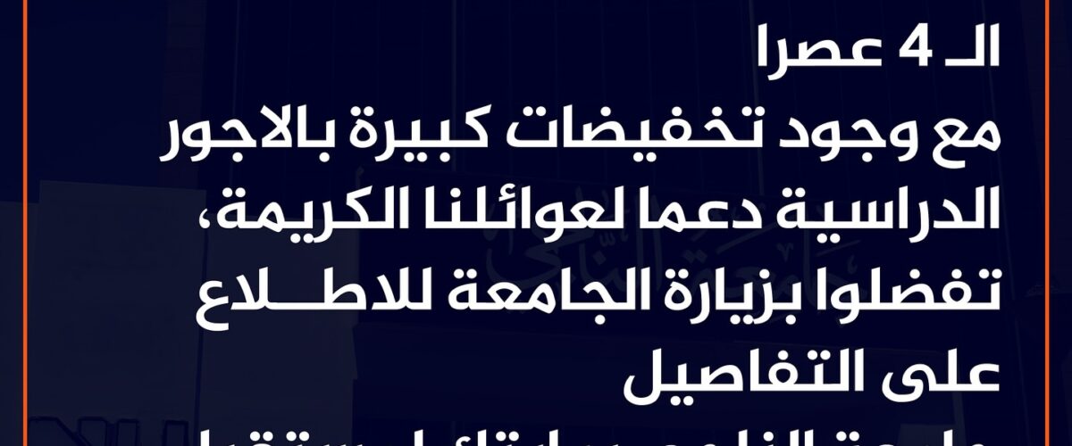اعلان هام .. التقديم مفتوح بجامعة الناجي لطلبة الدور الثالث يوميا من الساعة الـ 9 صباحا حتى الساعة الـ 4 ... قراءة المزيد