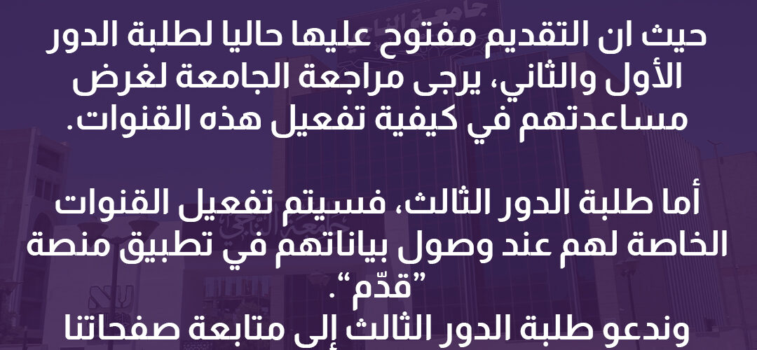 تم رفع بيانات خريجي الدور الثالث عبر منصّة قدّمAbdulrazzaq Alsaeed19 November، 2025تمّ رفع بيانات خريجي الدور الثالث عبر منصّة قدّم.نهيب بالطلبة الكرام مراجعة الجامعة خلال يومين لاستكمال إجراءات التسجيل بصورة أصولية. ... قراءة المزيد