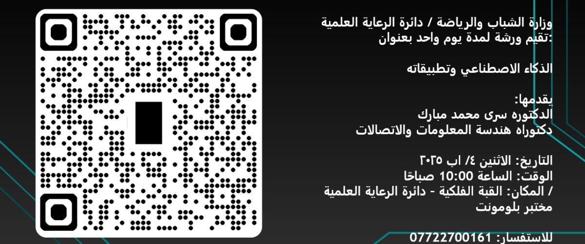 ندعوكم الى حضور ورشة عن الذكاء الاصطناعي 🎓 وزارة الشباب والرياضة / دائرة الرعاية العلمية 📊 تقيم ورشة لمدة يوم ... قراءة المزيد