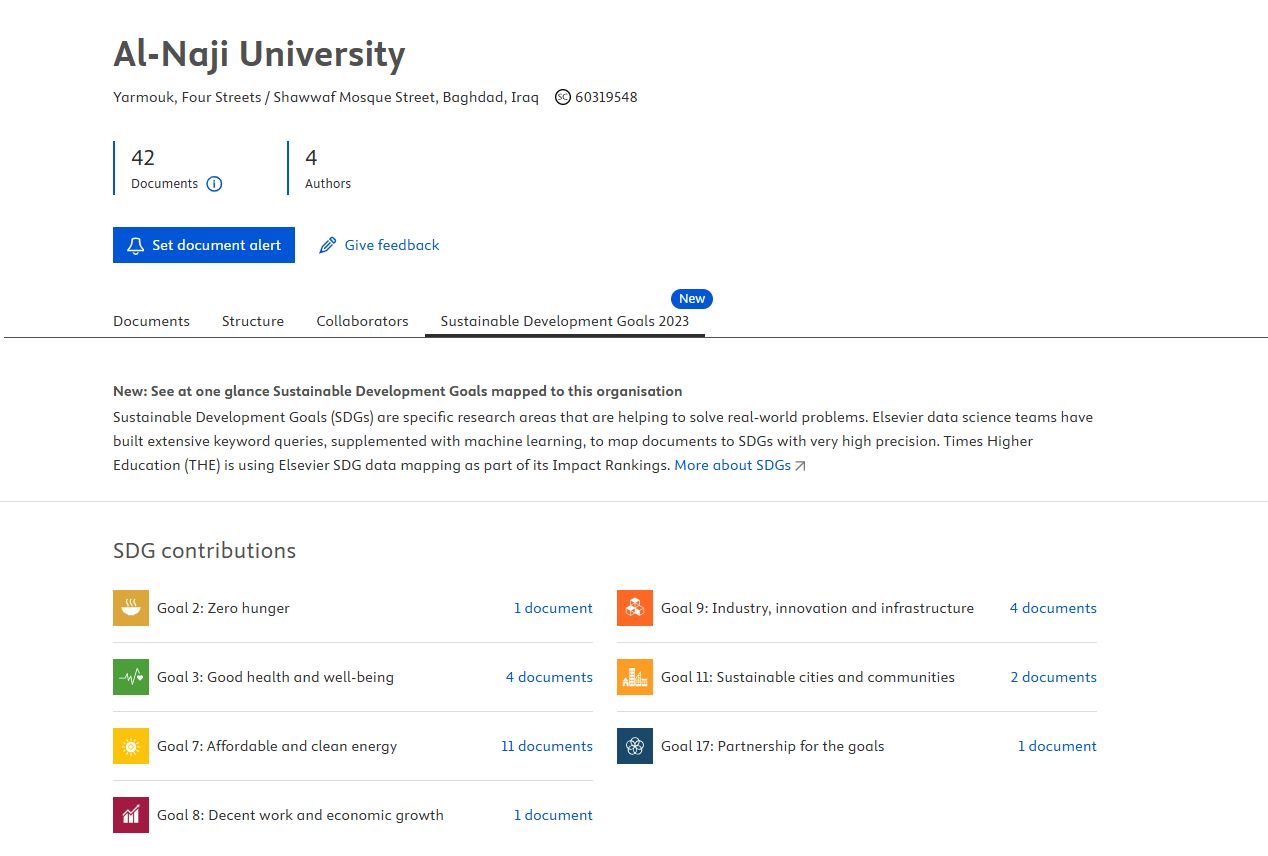 تُعلن جامعة الناجي عن إكمال المرحلة الثانية من متطلبات إنشاء وتوثيق حسابها الرسمي في مستوعب Scopus العالمي، والتي تتعلق بـ تصنيف بحوث الجامعة وفق أهداف الأمم المتحدة للتنمية المستدامة (SDGs).