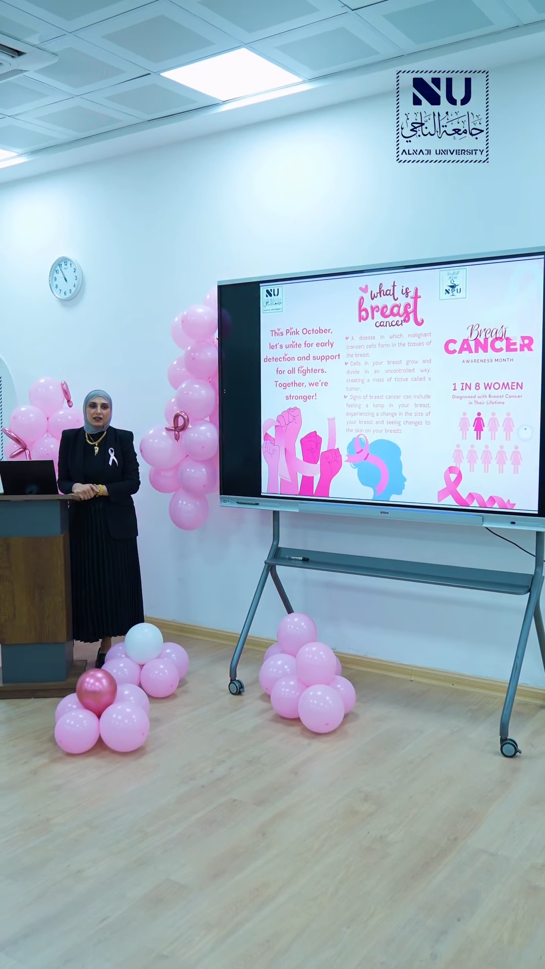 برعايةٍ كريمةٍ من رئيس جامعة الناجي، الأستاذ الدكتور منير حميد السعدي المحترم، وبإشراف عميد كلية الصيدلة، الأستاذ المساعد الدكتور مصطفى رعد عبد الباقي المحترم، وبمناسبة شهر أكتوبر الوردي للتوعية بسرطان الثدي، وبحضور جمعٍ من التدريسيين والطلبة، نظّمت كلية الصيدلة فعاليةً علميةً توعويةً تحمل رسالةً إنسانيةً سامية، القتها الدكتورة فرقان محمد, تهدف إلى نشر الوعي الصحي بين أفراد المجتمع، والتأكيد على أهمية الكشف المبكر الذي ينقذ الأرواح ويعيد الأمل إلى الكثير من النساء والعائلات.
