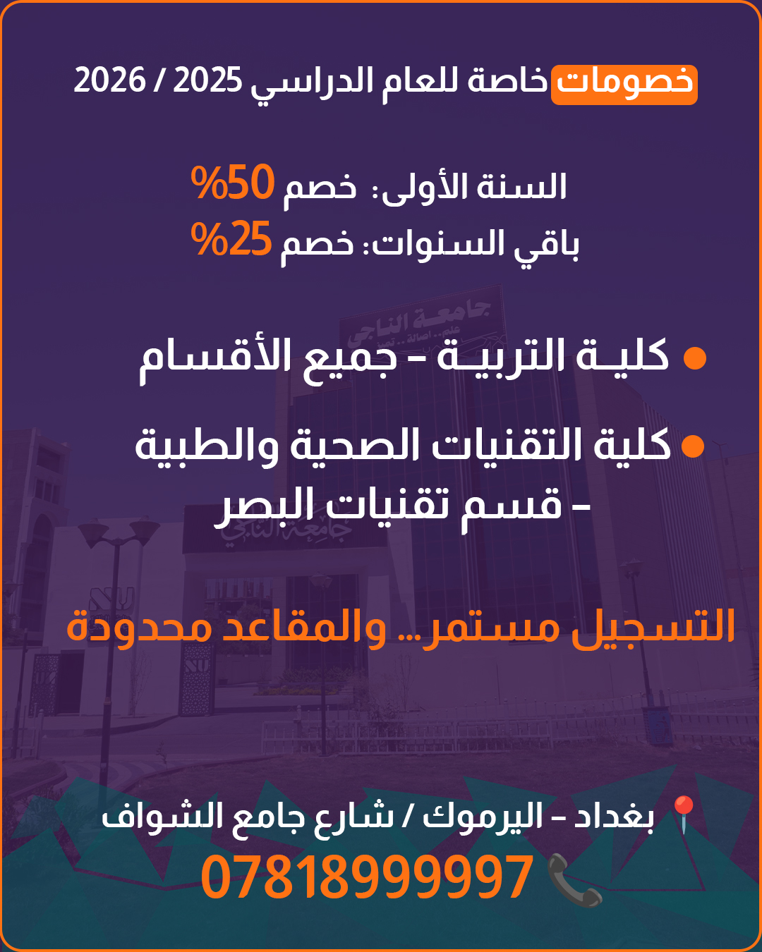 وفرصتك الآن للالتحاق بأقسام رصينة، وكادر تدريسي متخصص، ومختبرات مجهزة، ضمن بيئة أكاديمية داعمة تقدم تعليماً عالي الجودة.